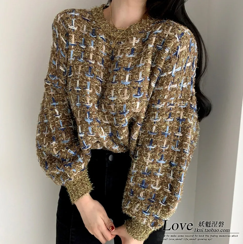 Related Product for RUGOD Women 's Sweater Korean Style Chic O-neck Bright Silk Color Contrast Plaid Knitted Pullovers